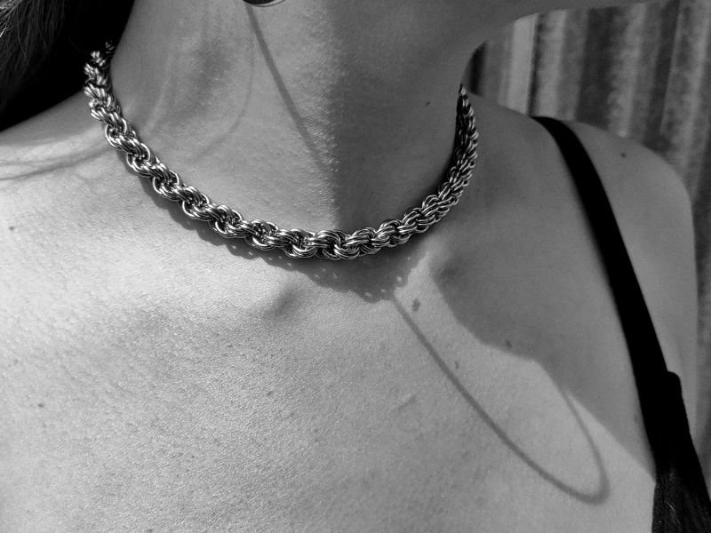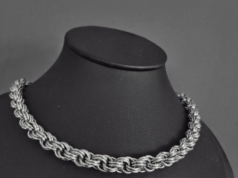 Cadena tejida en argollas de 8mm con patrón celta de cota de malla formando una espiral infinita.