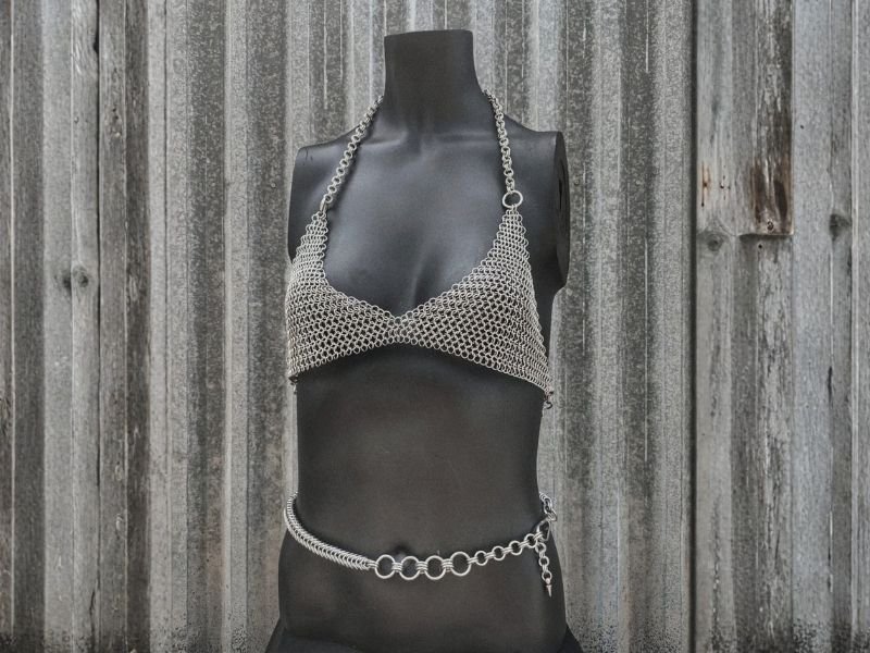 Prenda elaborada meticulosamente de manera artesanal con argollas de acero inoxidable, ligera y se amolda al cuerpo. Consta de dos cierres traseros en cuello y espalda.
