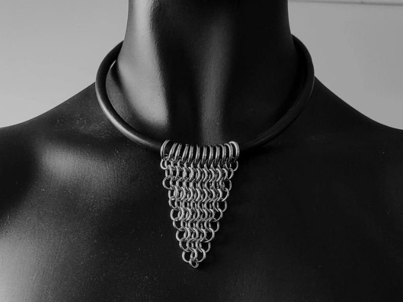 Gargantilla de caucho con tejido central en argollas de 8mm técnica cota de malla creando patrón triangular de escama.