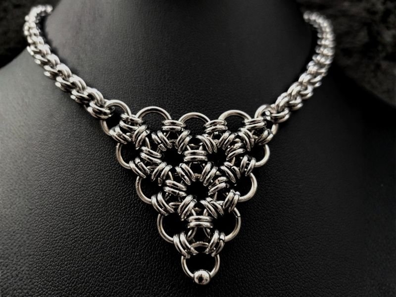 Collar tejido con argollas de 6 y 9mm jugando con distintos grosores y medidas de argollas para crear una geometría central en cota de malla y una cadena fina con mini argollas entrelazadas.